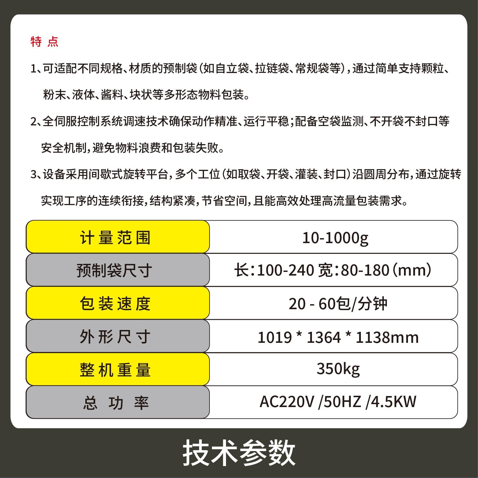 可適配不同規(guī)格、材質(zhì)的預(yù)制袋(如自立袋、拉鏈袋、常規(guī)袋等),通過簡單調(diào)整即可切換袋型,速度快、效率高,穩(wěn)定性好;支持顆粒、粉末、液體、醬料、塊狀等多形態(tài)物料包裝。