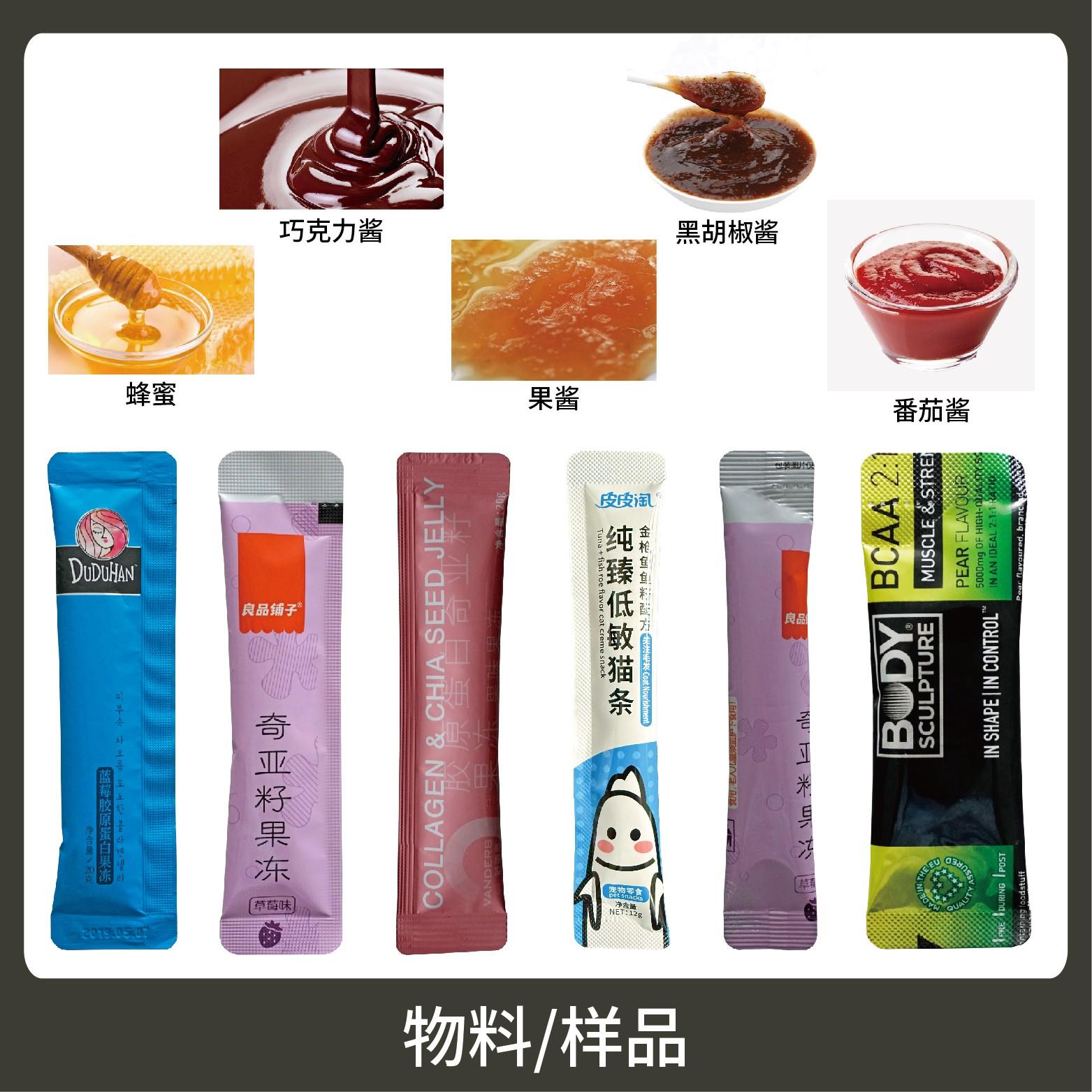 適用于行業(yè)中液體、醬料等物品的計量包裝,如貓條、果凍、糖漿、秋梨膏等,封口牢固更美觀。